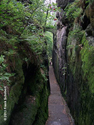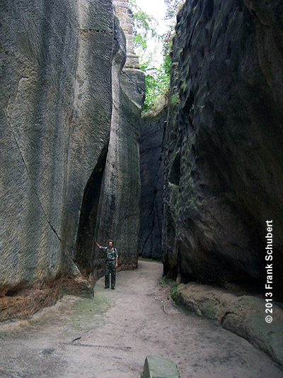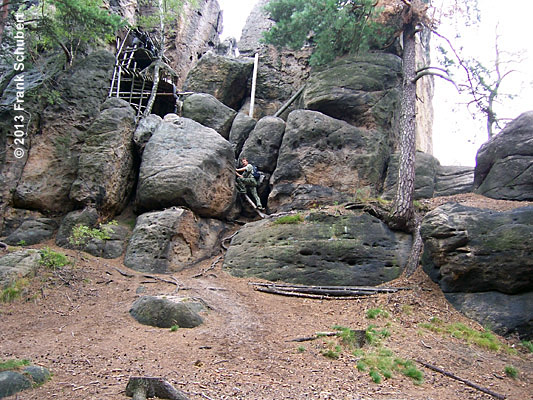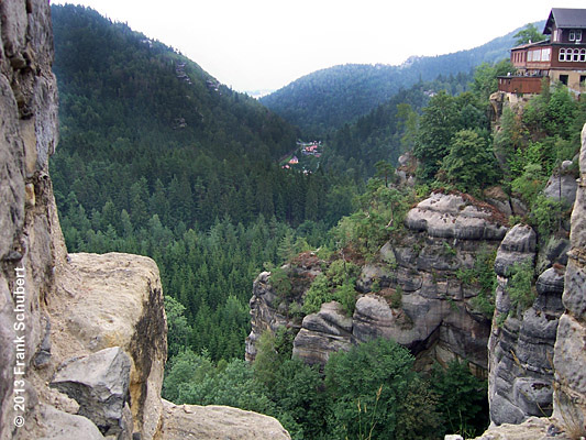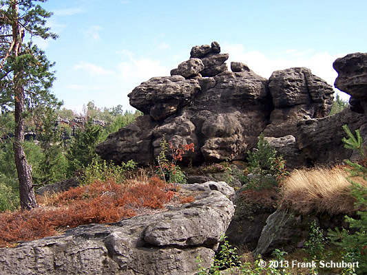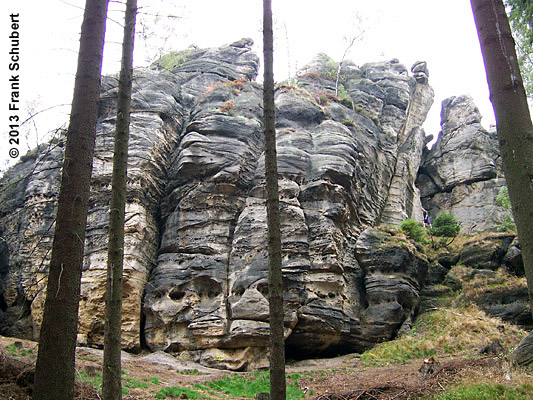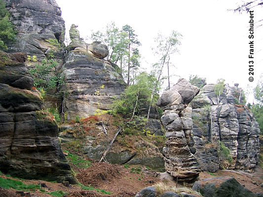 Entlang des Talkessels von Olbersdorf nach Oybin sind an den bewaldeten Talhängen Sandsteinfelsen
